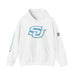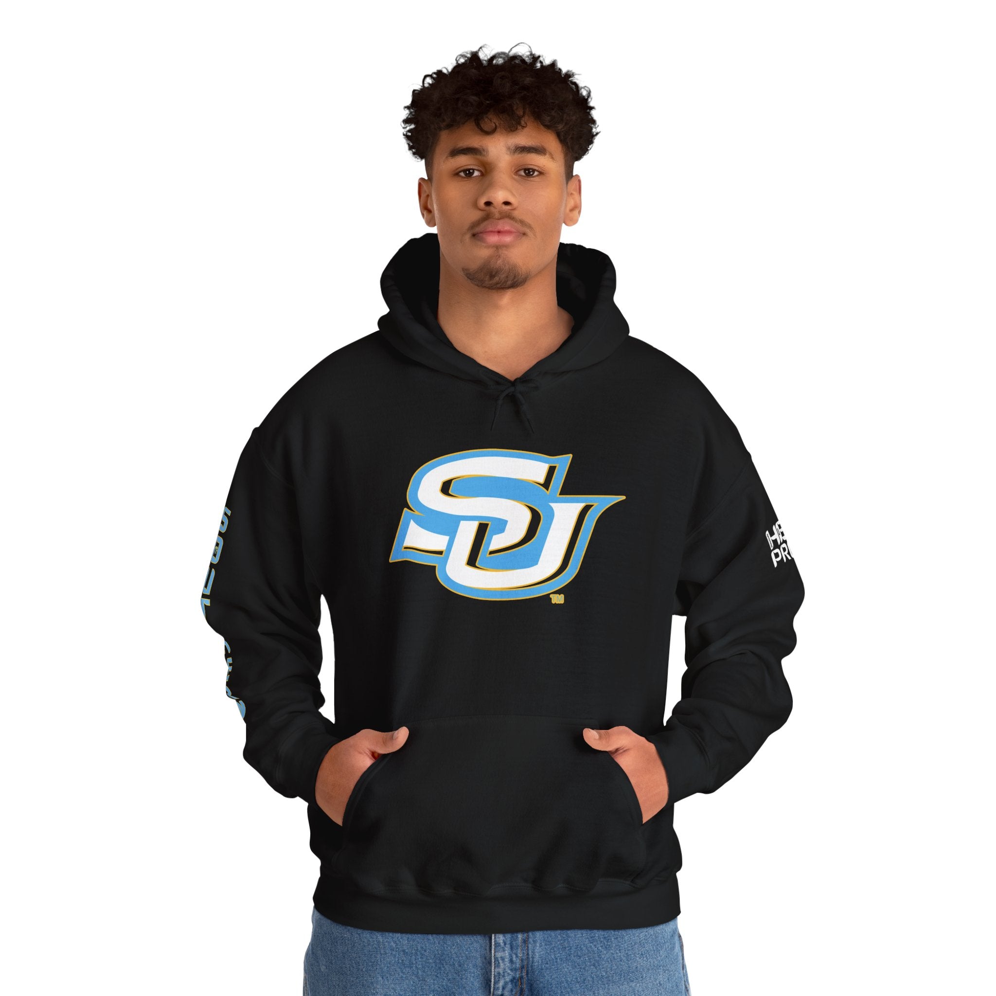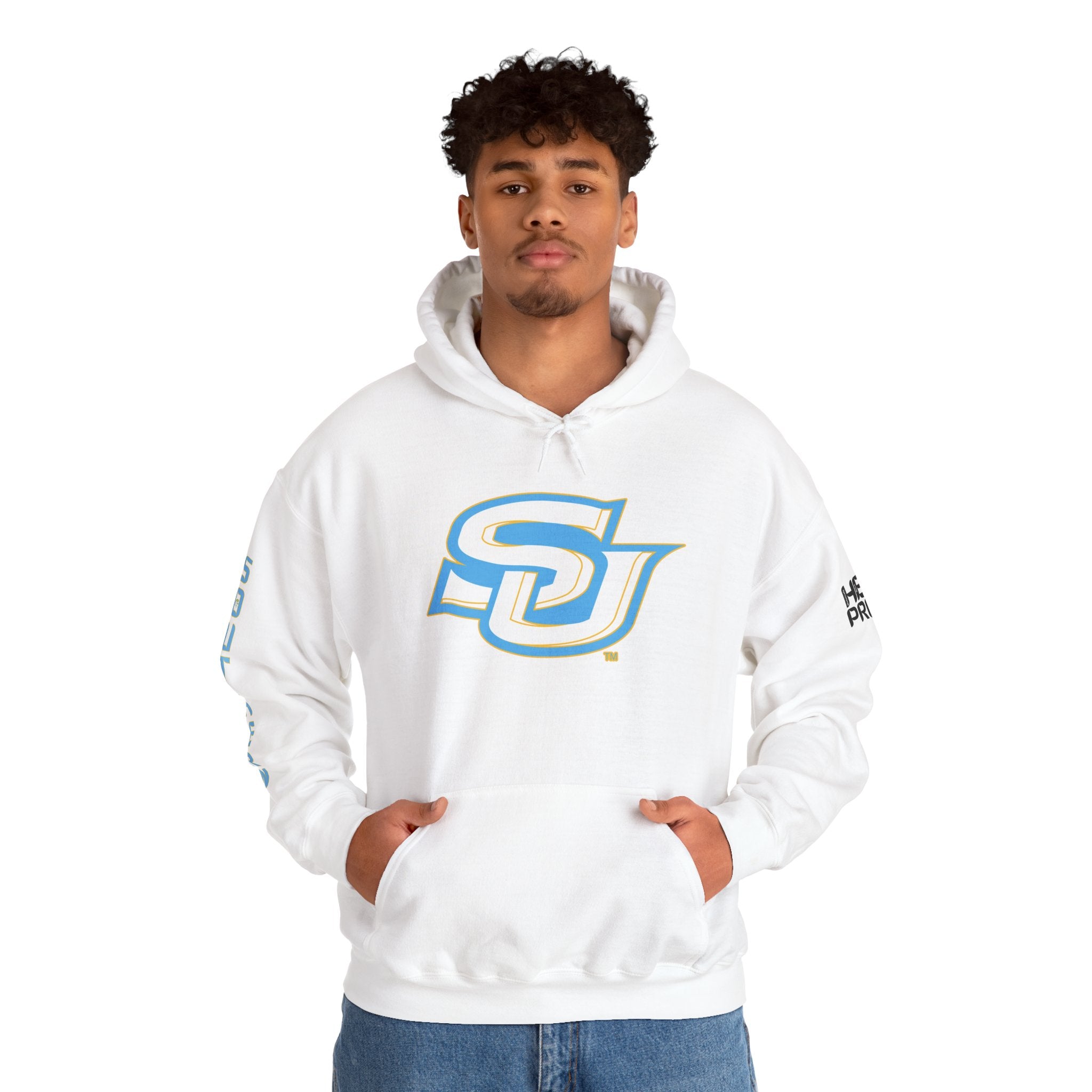 This unisex heavy blend hooded sweatshirt is relaxation itself. Made with a thick blend of cotton and polyester, it feels plush, soft and warm, a perfect choice for any cold day. In the front, the spacious kangaroo pocket adds daily practicality while the hood's drawstring is the same color as the base sweater for extra style points.